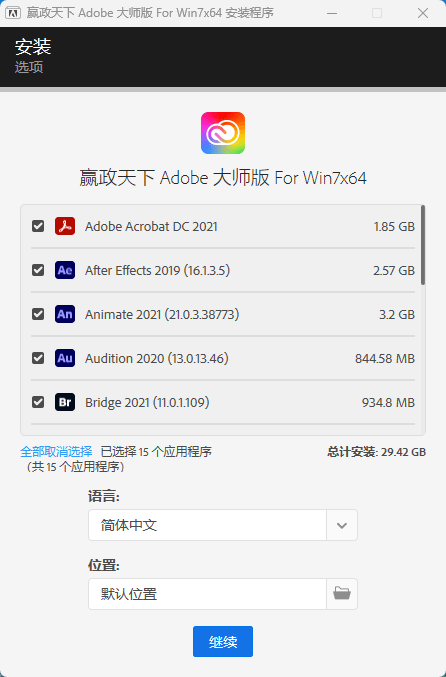 本版本是vposyd大佬针对64位 windows7老系统而修改的一款adobe全系列合集,一般又简称为adobe大师版win7版, 本版分为大师版和SP版,可根据个人需要安装。若覆盖安装失败,建议卸载对应APP或再安装。